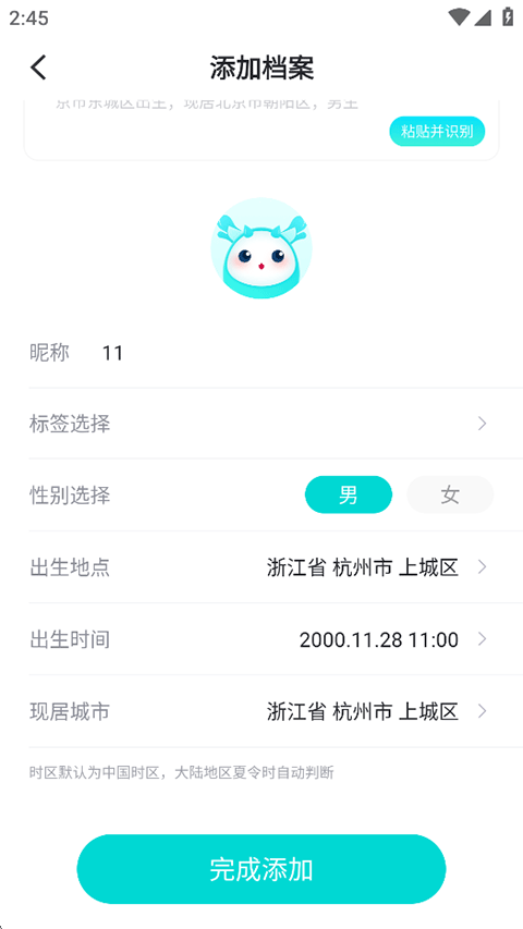 2、添加个人档案,完成性别姓名,出生时间、地点等信息的填写,然后点击完成添加;