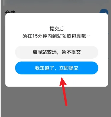 2、提交的时候,系统会提示必须15分钟内到驿站领取包裹,点击立即提交;
