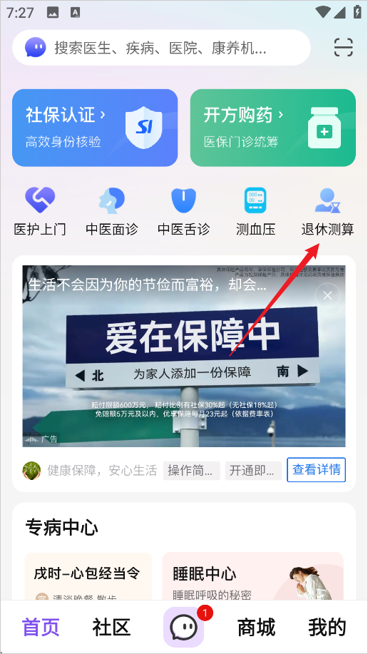 1、进入老来健康App后在首页位置选择退休测算