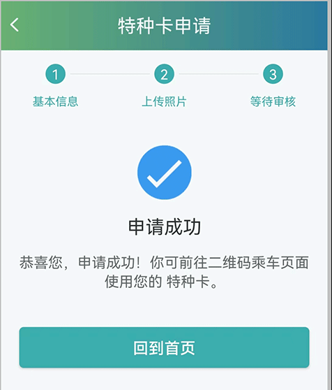 7、填写无误,界面显示“申请成功”。回到首页,在最下方点击进入“扫码乘车”,即可正常使用。