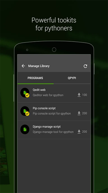v3.9.2QPython3手机版,外号俗称大蟒蛇,这款软件当年在Symbian系统的时候就是一代神器,它的专业性很强。现在是可以在安卓设备上使用且可以运行python脚本的一个程序,软件内容包含了python解释器、编译器、QPYPI、二维码阅读器以及一些安卓专用的精彩特性。软件支持运行多种类型的项目,包括控制台程序,SL4A程序,WebApp项目等等。其中,软件特别整合和拓展了安卓库的脚本层(SL4A),因为它是能让你用Python驱动安卓工作的重要步骤,并且您还可以借助SL4A特性,使用Python编程来进行安卓编程,如安卓App接口、安卓资源管理器、第三方应用整合和硬件管理器。感兴趣的朋友们、学习编程的朋友们都是可以下载使用下哦,这真的是一款非常赞的安卓上的Python。