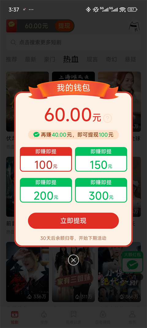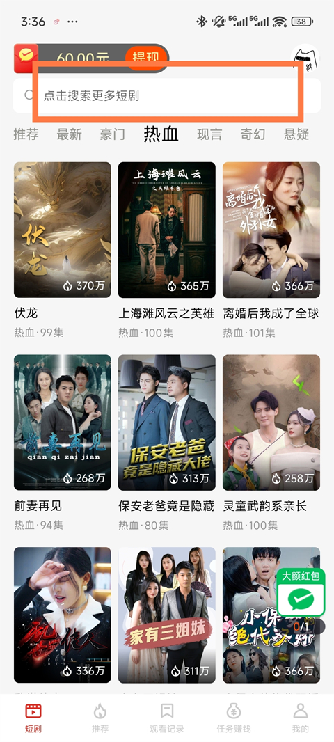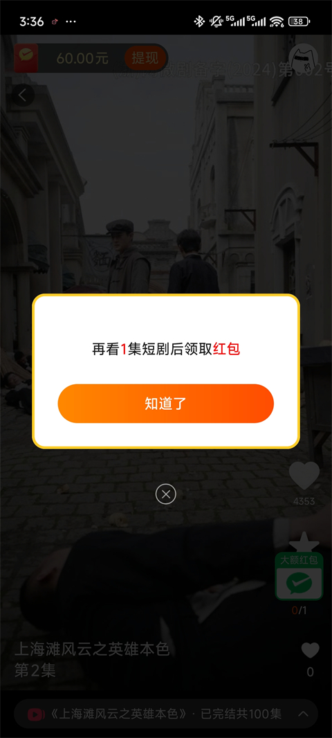 2、找到想看的进入观看,在这里会显示再看几集获得红包