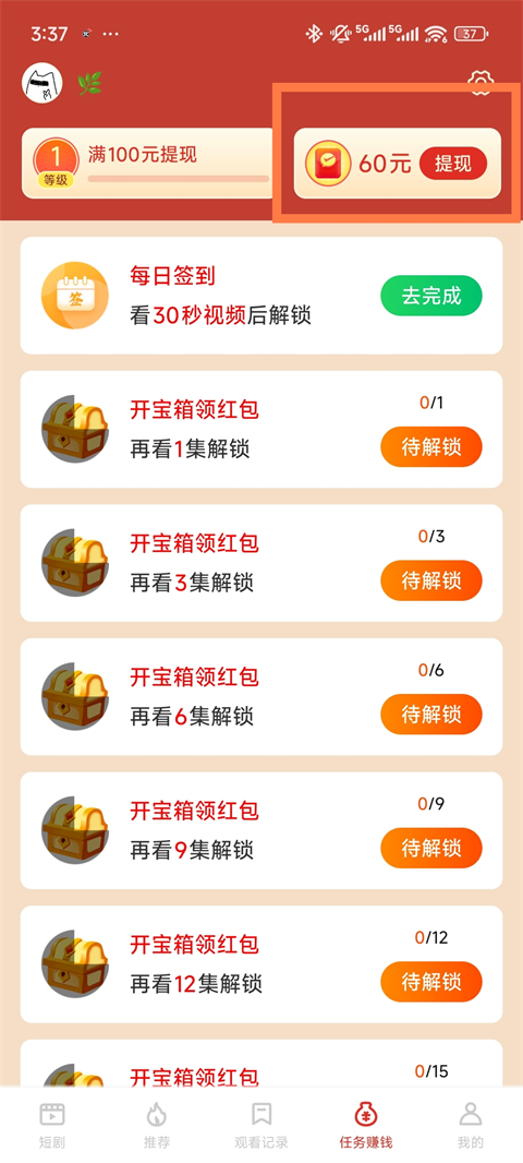 3、除此之外点击任务赚钱板块,这里可以看到怎么获得红包