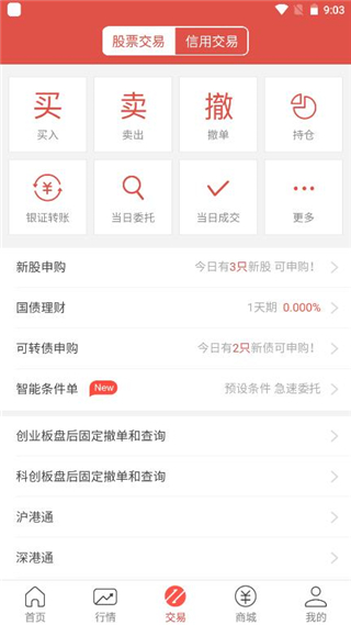 3、进入交易界面,用户可以查询股票交易、信用交易等功能