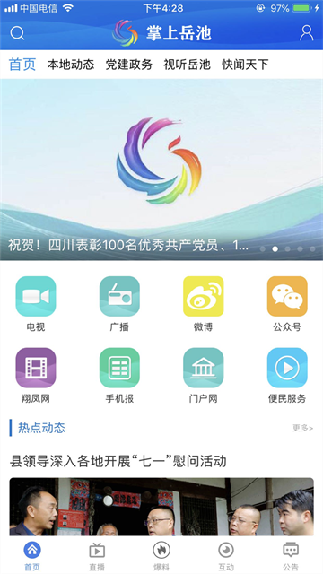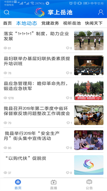 v1.2.28掌上岳池app是由岳池县融媒体中心推出的一款本地新闻资讯服务平台,在这里用户可以了解到最新的本土资讯和时事要闻,同时还有视频、广播、短视频等栏目供大家观看,并可以订阅自己感兴趣的栏目,观看精彩的小视频。其中各种精彩的新闻资讯内容也都包括在内,用户可以自由的进行阅读,丰富的新闻讨论内容,让用户在阅读信息时可以参与互动。目前掌上岳池app设置有本地动态、党建政务、视听岳池、快闻天下等栏目,能为注册用户提供新闻资讯,政务信息咨询、审批事项办理、水电气费用缴纳、各类信息查询、新闻爆料、民情反映等各类服务。有需要的朋友们欢迎前来下载体验。