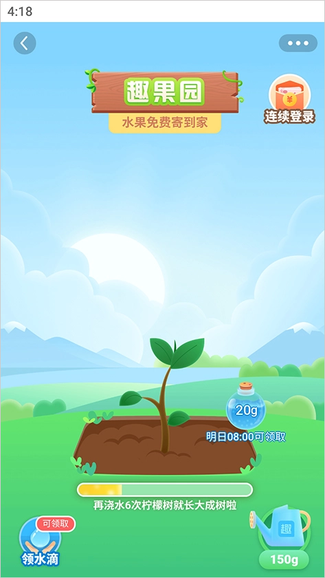 3、种植树苗成功即可免费获取水果,水滴可通过做任务完成。