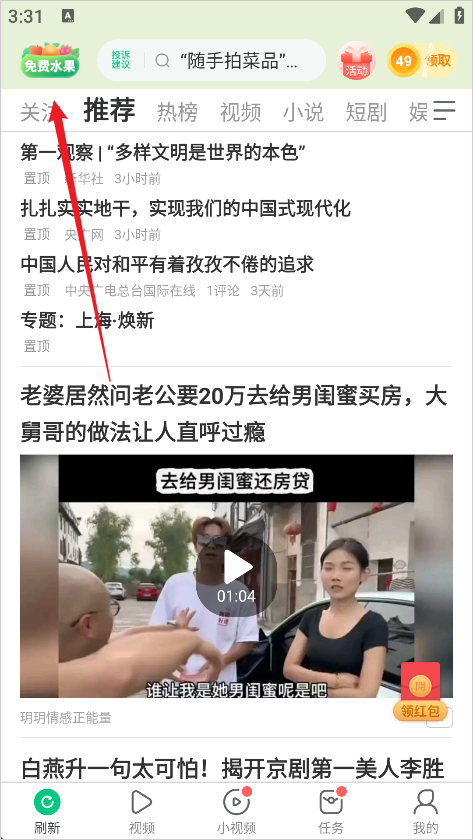 1、打开趣头条App后在首页找到【免费水果】,点击打开。