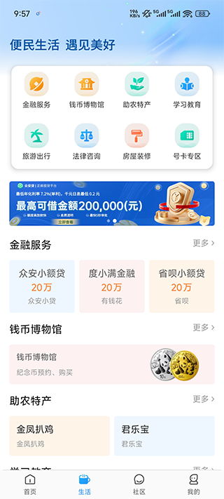 3、进入生活板块这里拥有【金融服务、旅游出行、法律咨询等服务】旅游出行则是可以订购酒店、机票、火车票等服务,法律咨询可以质询法律相关的问题。