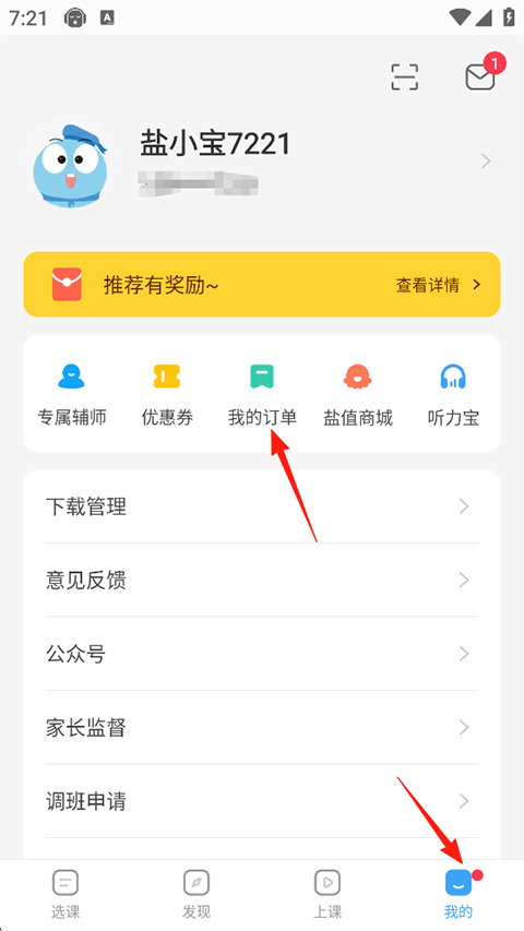 1、打开盐课堂APP,点击我的-我的订单;