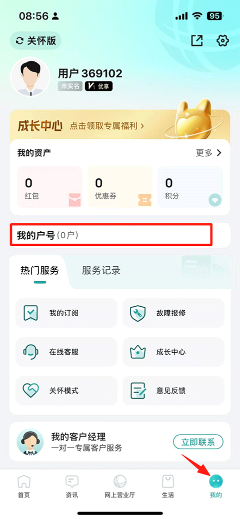 1、打开网上国网APP,进入“我的”页面,找到并点击“我的户号”选项;