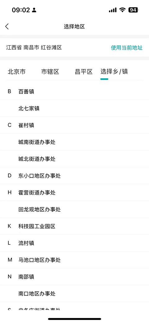 3、选择你所在的地区,精确到乡/镇;