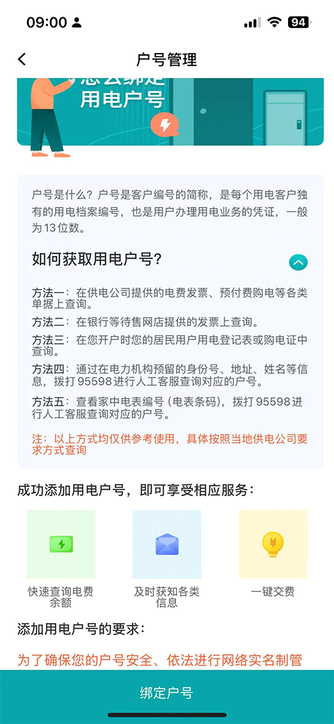 2、在户号管理页面中,你会看到所有已绑定的户号列表;当然首先需要绑定户号,详细获取用电户号的方式如下图(目前为了安全,平台已不允许绑定他人户号了);