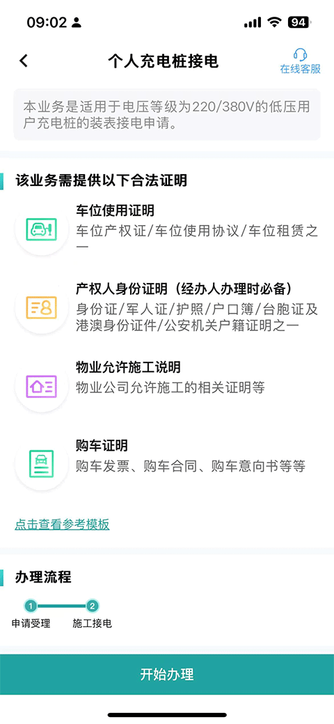 4、该业务需提供如车位使用证明、产权身份证明、物业允许施工说明以及购车证明等合法证明,确认已准备齐全点击下方开始办理按钮即可。