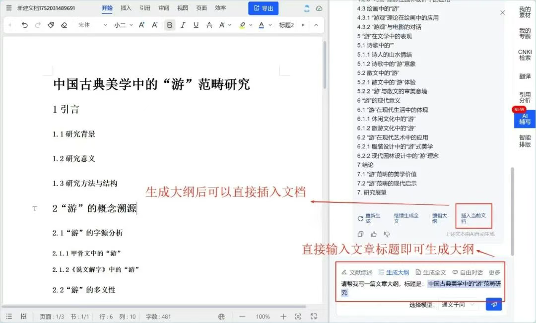 生成后点击【插入当前文档】,大纲即可插入内置文档,省去手动排版的麻烦。