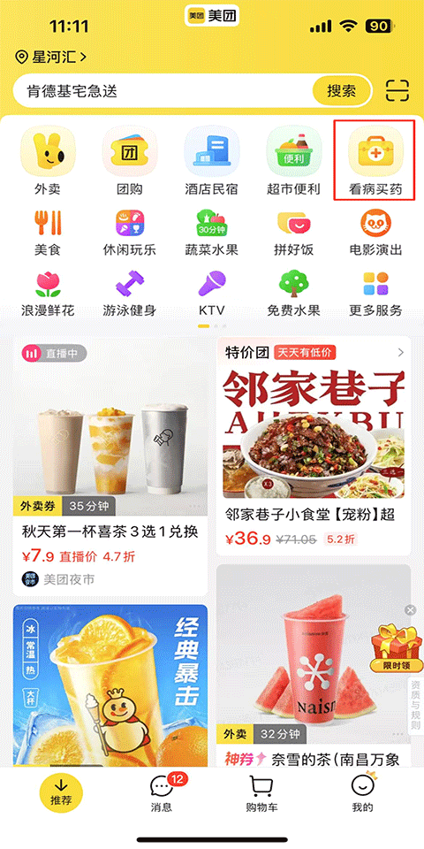 1、打开美团买药APP(美团),在首页找到并打开【看病买药】服务入口;