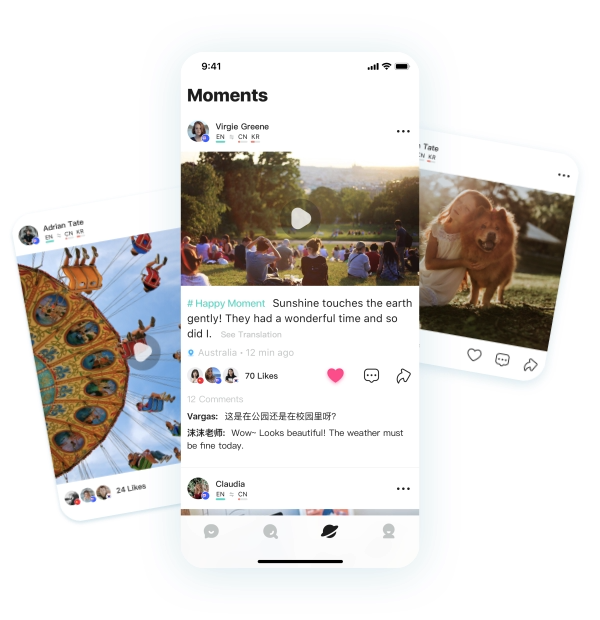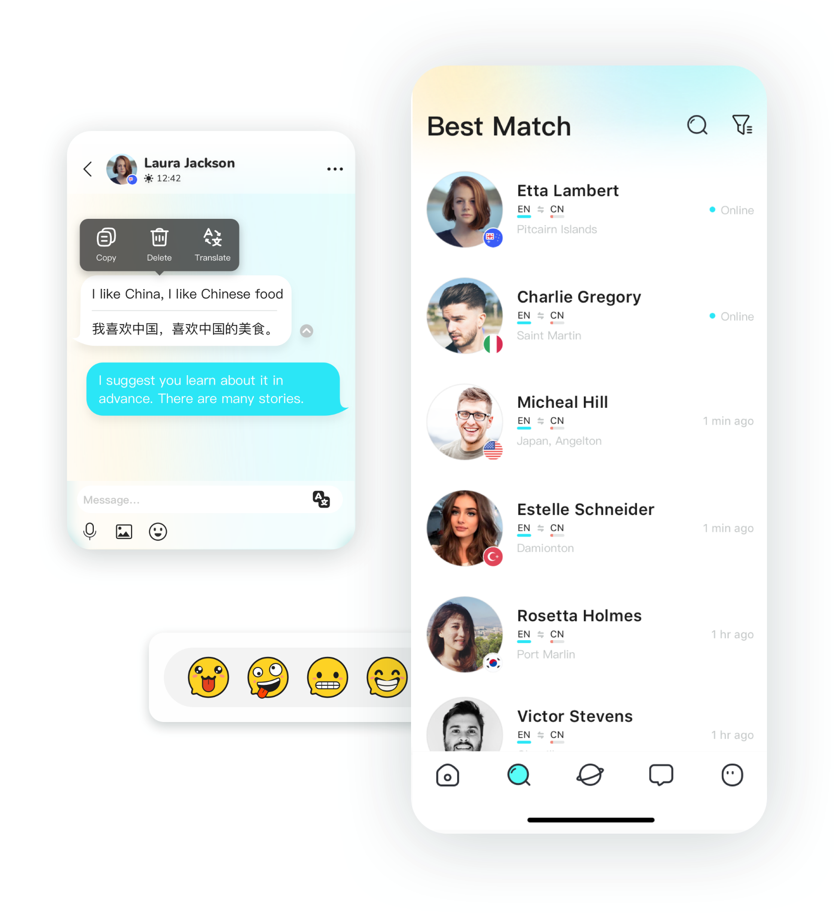 Yeetalk外国交友软件还自带翻译工具,支持全球103种语言,可以将你不懂的任何语言翻译成你的母语或你想要的语言,并且不限次数,只需要下载选择你的国家/地区和母语,就能轻松和老外交流,探索世界,与世界对话!