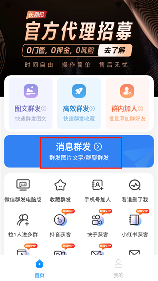 1、打开一键群发软件,点击消息群发