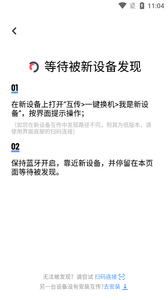 2、数据发送机选择“我是旧设备”--数据接收机选择“我是新手机”--选择手机品牌--等待识别完成或扫描界面二维码连接--同意