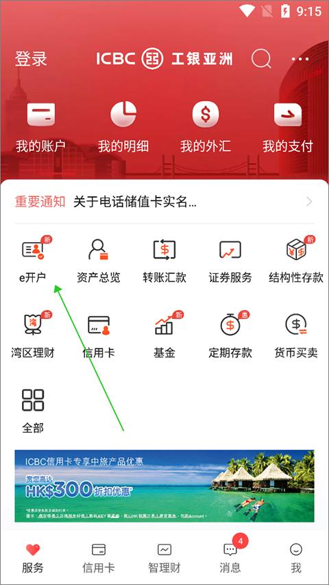 开户可前往工银亚洲手机银行【服务】页面下点击【e开户】
