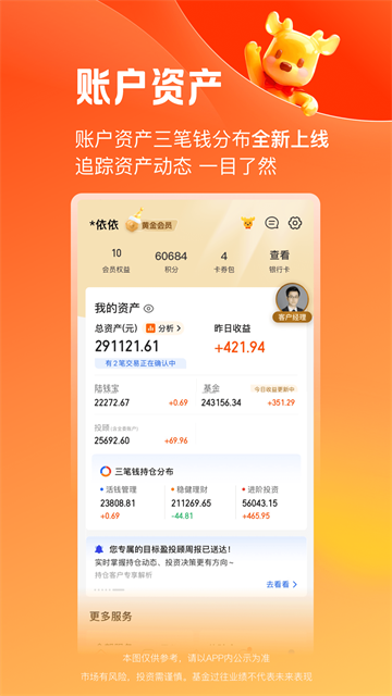 3、账户资产,账户资产三笔钱分布全新上线,追踪资产动态一目了然;