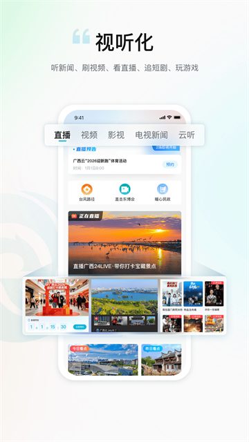 视听化——视频、短剧、直播、云听、电视新闻、游戏,打造沉浸式视听娱乐体验;