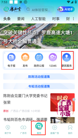 1、打开软件可以在广西号板块观看各种热榜新闻,直播板块可以看到广西的各种直播。