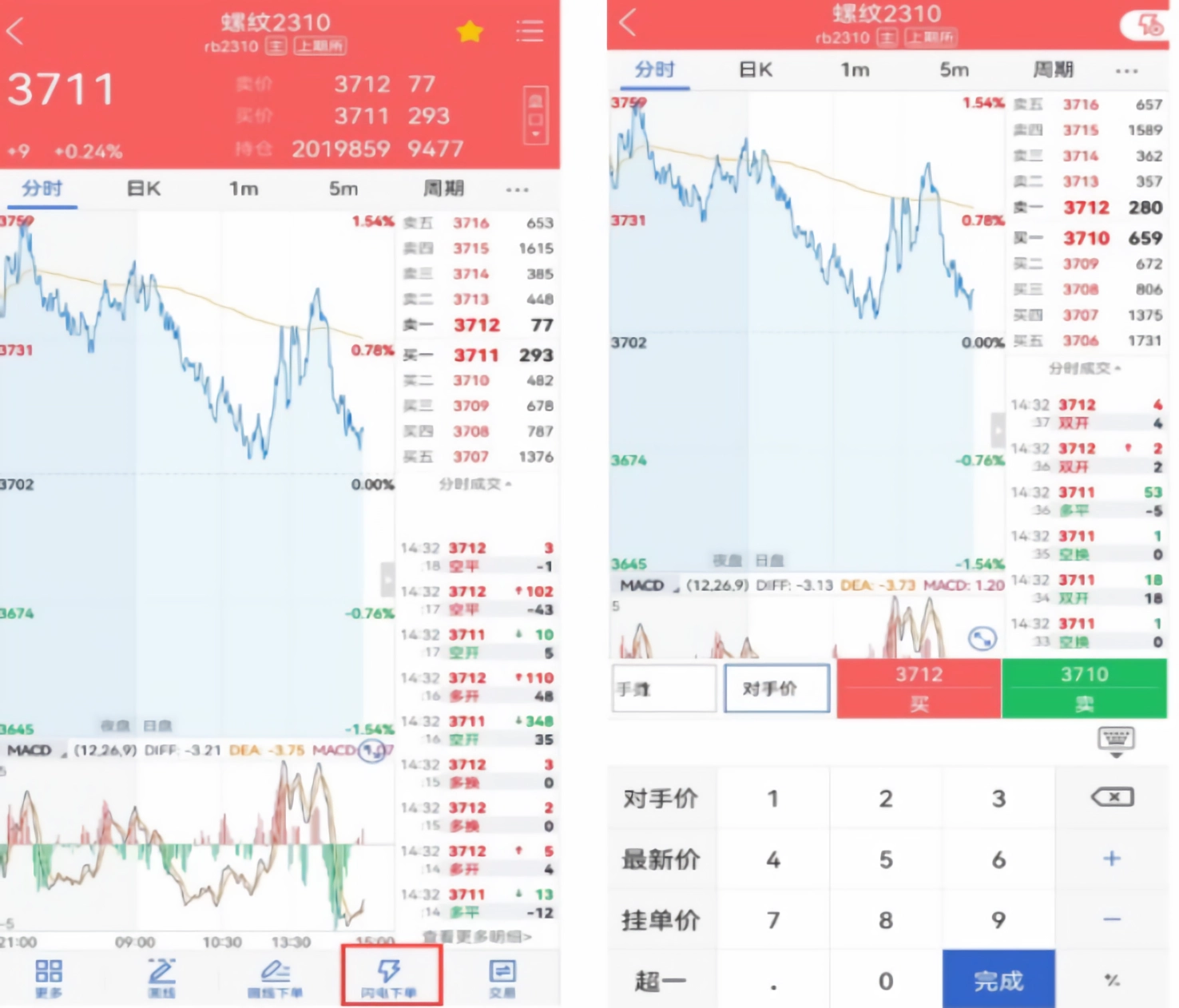 在分时图或者K线图上,点击闪电下单,进入闪电下单界面,选择手数和价格点击“买”或“卖”完成下单操作