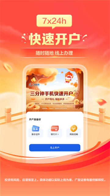 广发证券开户app是广发证券官方倾力打造推出的一款移动自助股票开户软件,有了它大家可以足不出户就能享受开户的乐趣。该软件运行流畅、页面设计清爽、操作简单容易上手、服务丰富贴心,且全程手机自助开户,只需3分钟、操作简单、信息安全,支持24小时随时随地开户,开户过程中不收取任何费用。此外,广发证券开户app拥有全国近7000名客户服务人员还能24小时在线咨询各类问题,满足客户在产品购买、证券交易、业务办理等方面的需求,解决用户遇到的各类困难。欢迎有需要的用户下载体验!