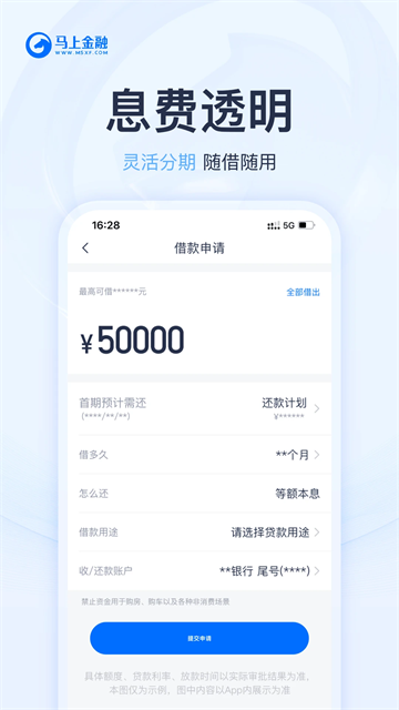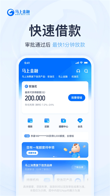 v4.12.1马上金融是一款循环额度的信贷软件,用户可以在额度范围内进行分期、消费,软件能够为用户提供安全、专业、智能、便捷的消费借款、部分商品免息购物服务。它是银监会批准成立的,持有正规金融运营牌照的金融机构,致力于成为全球被信赖的金融服务商,运用大数据模型和全球领先风控技术打造更专业的消费信贷产品“马上金融”,做您随时提现的小钱袋。用户只需要身份证就能快速借贷,贷款额度高、利息低,专业可靠,审批快速通过。它会根据用户的信用情况,提供最高20万元的贷款额度,为用户解决经济危机,有需要的朋友快来下载吧!