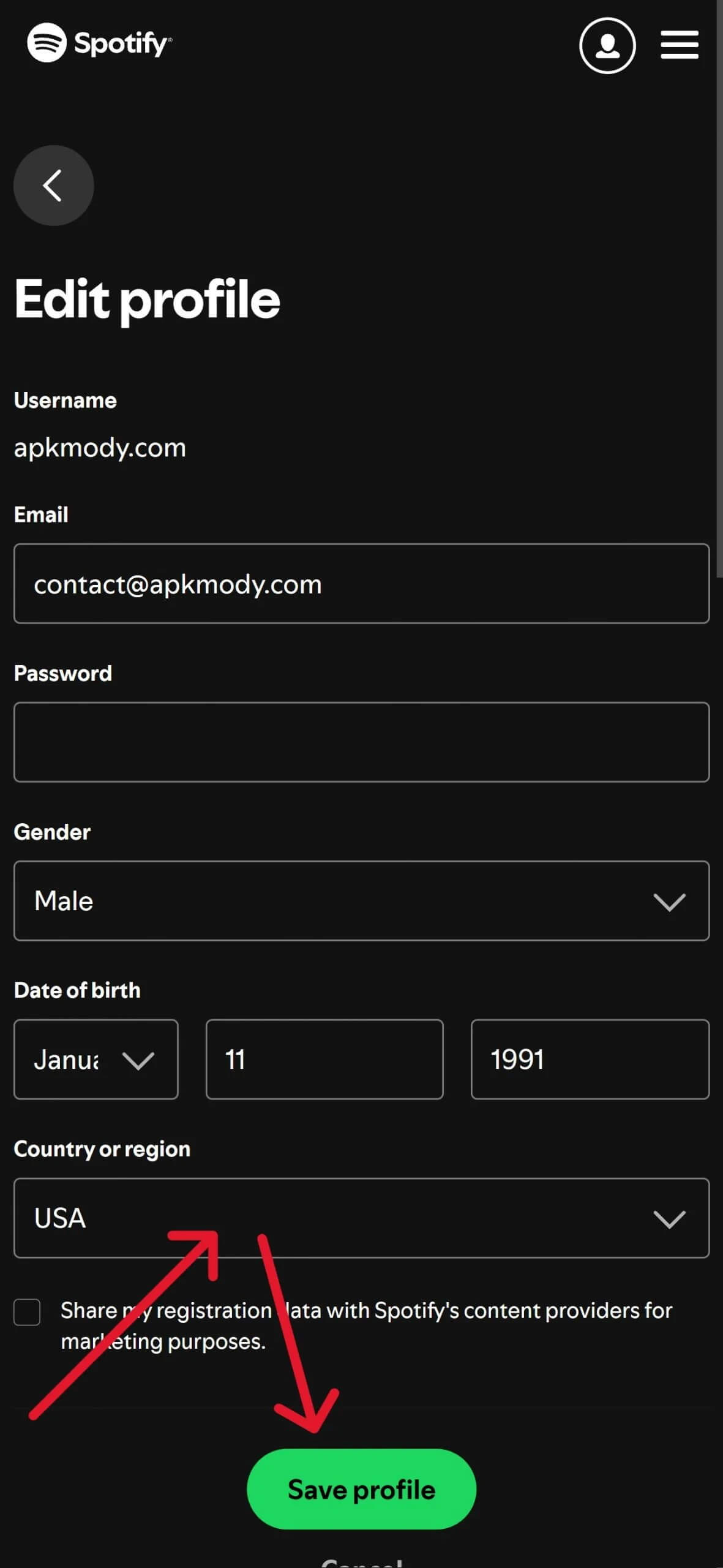 浏览器访问 https://www.spotify.com/us/account/profile/,登录到你的站点帐户,并通过加速器改变你的区域。