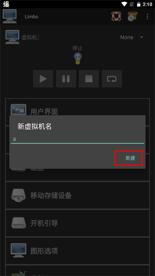 5、在弹出的窗口里填写自己新建的虚拟机配置的名字,名字可以随意,不过建议简单点,同时最好是英文;这里用a示例。填写完以后,点窗口右下角的“新建”。