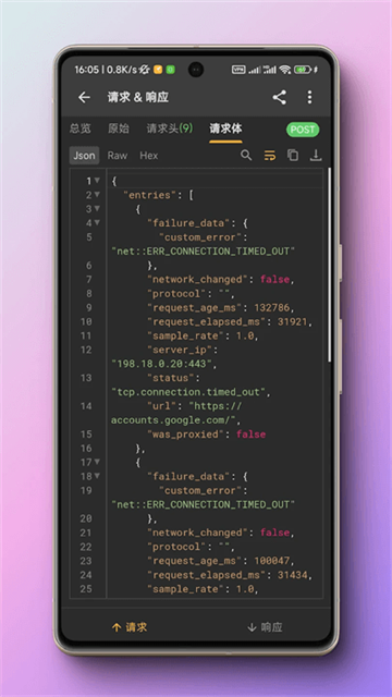 HttpCanary支持浏览一个网络请求的总体概况,包括URL、HTTP协议、HTTP方法、响应码、服务器Host、服务器IP和端口、Content-Type、Keep-Alive、时间信息、数据大小信息等。