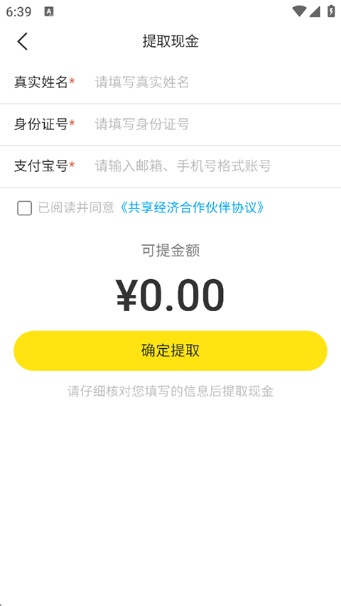 3、输入真实姓名、身份证号以及支付宝号,完成后点击确定提现即可。