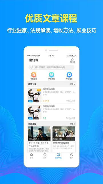 输出独家优质教程及精品文章,内容范围包括法律风险建议、政策解读、增收技巧、行业分析等,全面支持贷款经纪人学习成长。