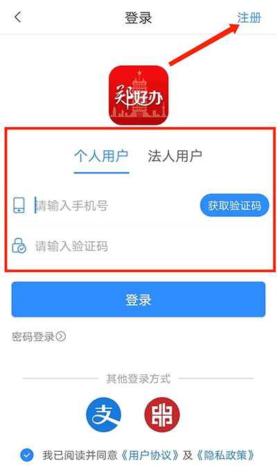 1、下载后打开郑好办app,在【我的】界面,选择上方【登录/注册】选项,