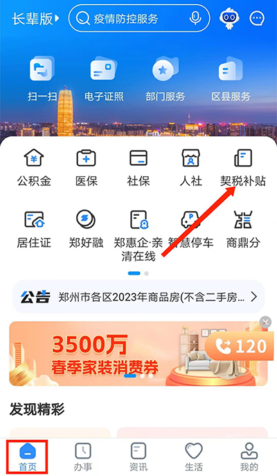 1、打开郑好办app,在【首页】界面,选择右上方【契税补贴】选项,