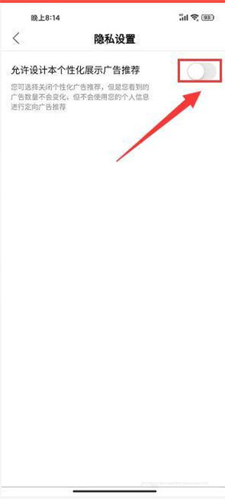 4、在隐私设置界面,单击允许设计本个性化展示广告推荐栏目右侧按钮。