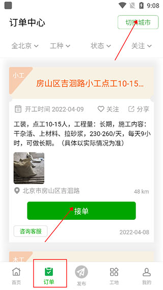登录APP后面,选择“订单”师傅们可以在这里看到订单信息,例如招什么工种、工程量上多少,还有具体是干什么的,最主要的是还有薪资是多少,不过师傅要是想去接单其他地方的单,可以点击右上角的“切换城市”