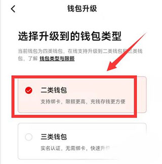 若还未显示数字人民币入口,进入钱包升级,选择“二级钱包”。