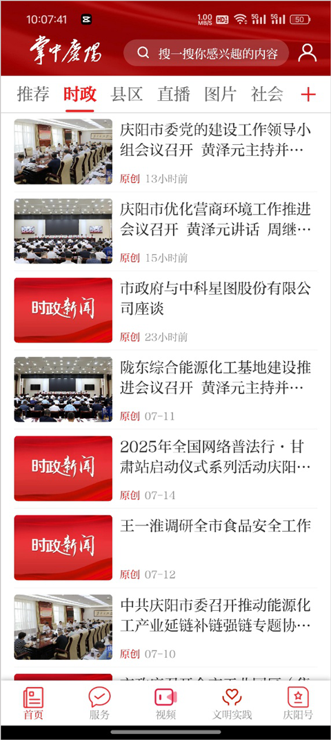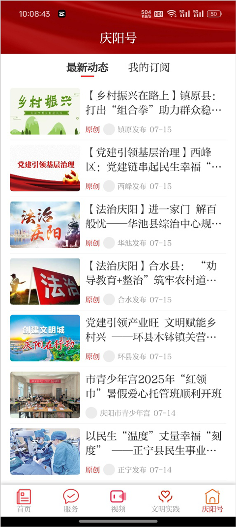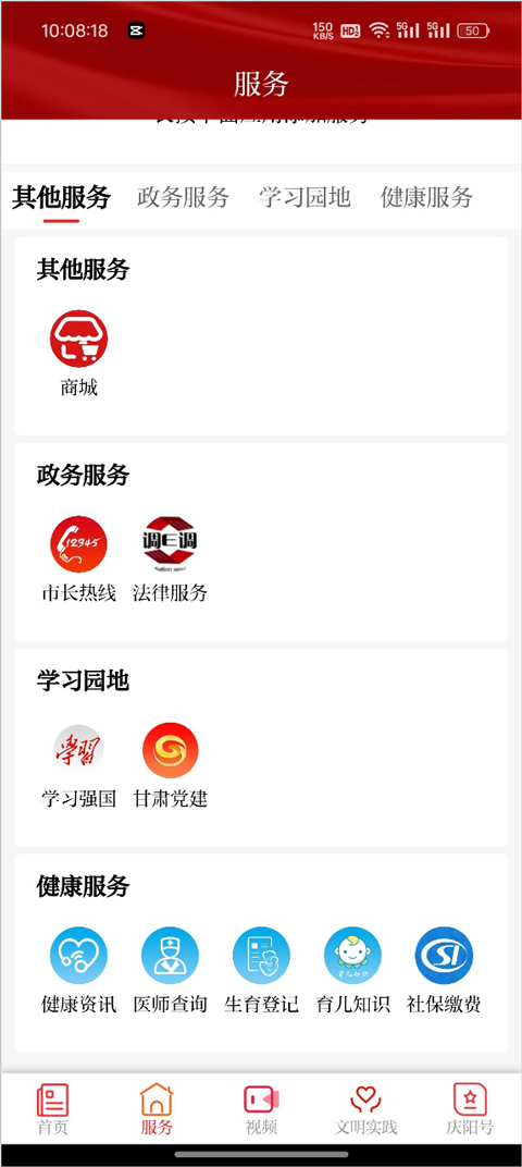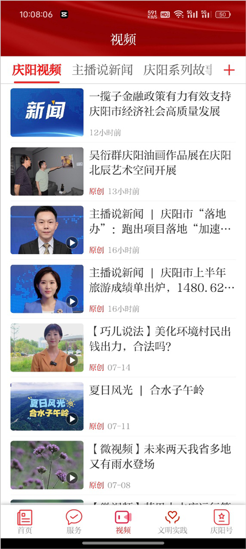 1、进入首页,我们可以看见庆阳市、视频、服务、庆阳号、我的五大板块;