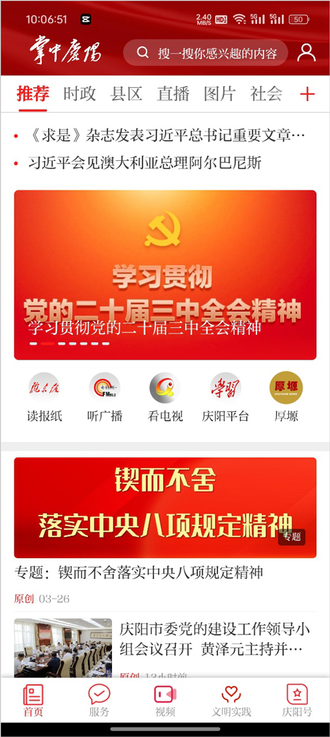 2、其中庆阳市中,有着推荐、时政、直播、图片、社会、本地、教育、文化、专题等选项;