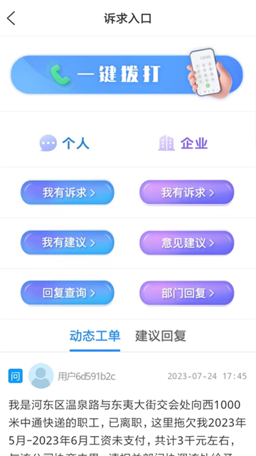 4、我的诉求:输入诉求内容、姓名、电话,选择地点即可在线诉求提交;