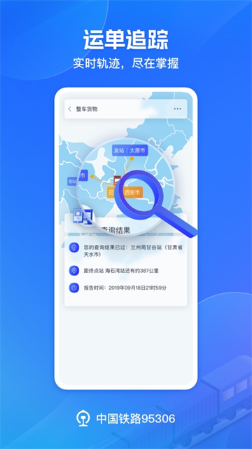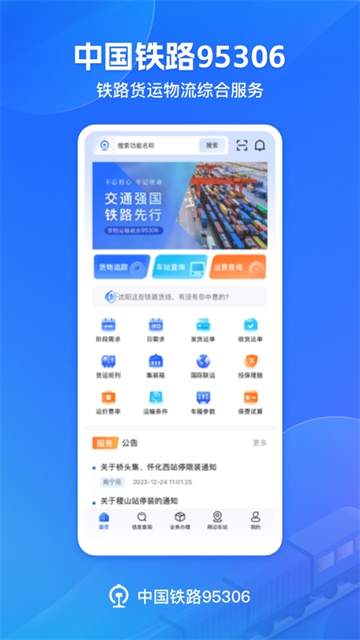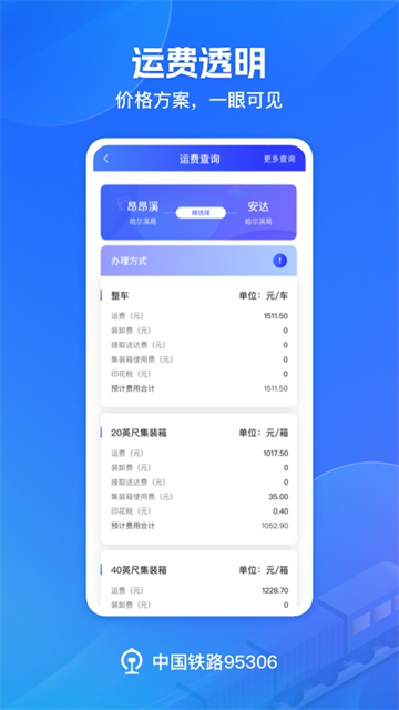 铁路95306app是一款为货物服务的软件,在这里你可以方便的进行铁路业务办理查询,有关于铁路运输货物的各种规章制度和流程,你都可以在这里快速的了解,而对于货物的安全这方面,软件可以实时在线追踪查询订单,货物的一切行动轨迹,都在你的掌握中,还有透明的运费和保险,你在这里可以查看自己所需缴纳的运费,也可以在软件中找到保险业务,为自己的货物上一份保险,让自己更安心,同时中国铁路局保护货物的安全,让你用的省心,用的放心,有需要的朋友快来下载体验吧!