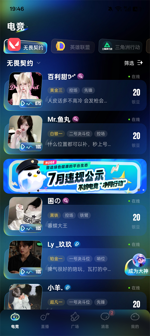 连接千万高校电竞玩家,汇聚众多电竞教练大神,一键找到悦耳声线、有趣又高超技术的导师,带你默契上分!寻找英雄联盟、王者荣耀、和平精英、永劫无间、绝地求生等电竞教练指导。