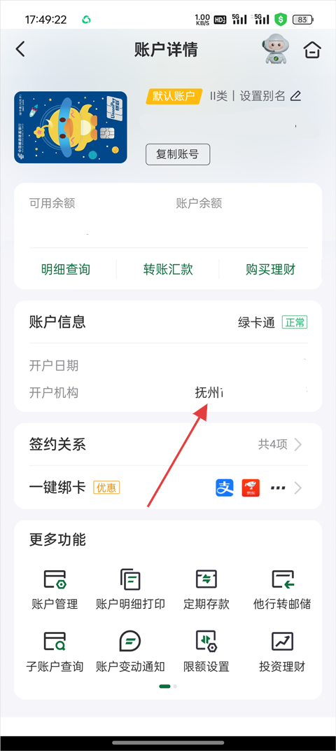 3、在卡片信息页面即可看到对应的开户行名称。