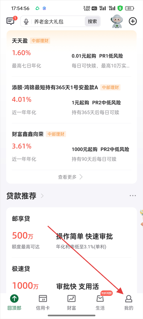 1、打开邮储银行App,点击底部导航栏的【我的】进入个人中心;