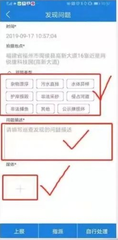 6、在发现问题页面填写好相关的信息;上报:我处理不了,需要请上级 (河长)协调;指派:我可以将任务指派某个下级负责人(河长办、联系部门、下级河长)处理问题;自行处理:我自己发现了问题,且力所能及,就无需上报,自行填写处理结果;进度反馈:我接收了任务,但是处理时间较长,可以在期间填写一些处理进度说明。