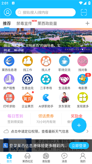 聚合 【莱西信息港】【找工作】【找人才】 等多类生活服务入口,还有每日签到、领话费券等福利活动。