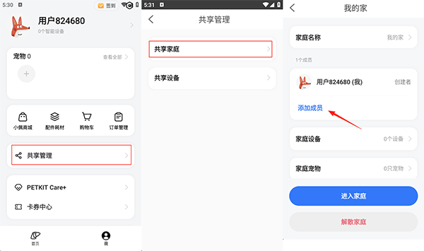 1、在本站下载安装并打开小佩宠物APP,依据操作步骤:我-共享管理-共享家庭-我的家-添加成员,将共享人员添加到设备中就可以了。