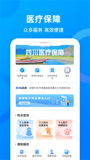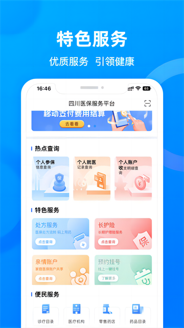 答:“四川医保”APP是一个全省城镇职工和城乡居民参保人员都可以使用的手机应用软件。目前可实现参保情况查询、职工个人账户余额查询和收支明细查询、定点医院药店查询、药品目录查询、诊疗服务目录查询、医用材料目录查询、异地就医备案办理、投诉举报,药店购药二维码扫码支付、医院普通门诊移动支付、在线挂号等功能。